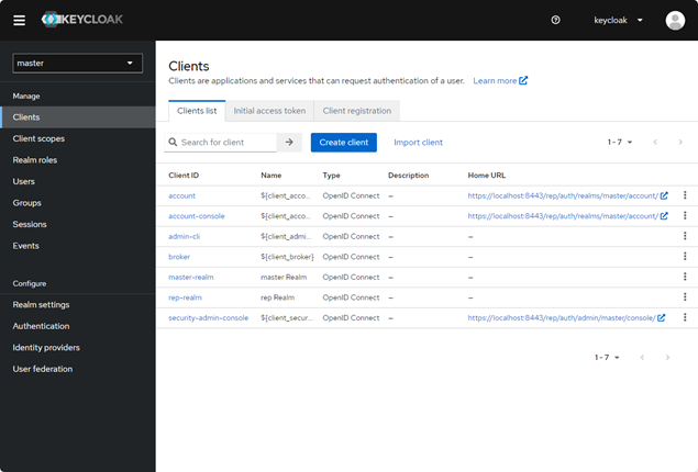 Username: keycloak Password: keycloak123 The Keycloak Admin Console is launched: