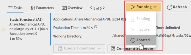 You can abort an actively running job by changing its status to aborted. When a job is aborted, the task evaluation stops and any output files generated up to that point are collected.