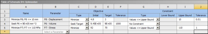 In a DesignXplorer Optimization cell, objectives and constraints can be defined as described in Defining Optimization Objectives and Constraints in the DesignXplorer User's Guide. This image shows an example: