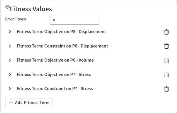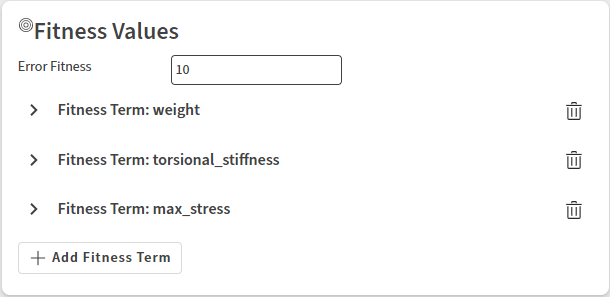 Note: Changing or deleting fitness terms do not invalidate evaluated jobs but rather triggers the re-evaluation of fitness values for all jobs.