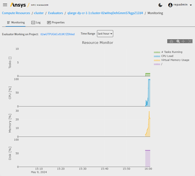 When viewing an evaluator's details you can view a plot of the evaluator's performance metrics to gain insight into how the resource is being utilized.