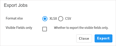 To export only the job property fields that are currently displayed in the jobs table, enable the Visible Fields only check box. If left disabled, all possible job property fields (including hidden fields) will be included in the export. For information on available fields, see Configuring the Job List Display.