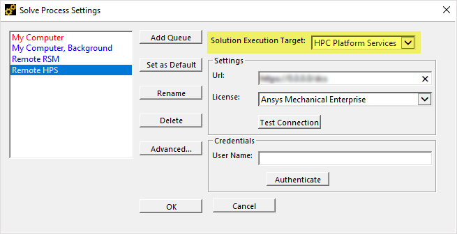 In Mechanical, Ansys HPC Platform Services is available as a solution execution target in the Solve Process Settings. For example: