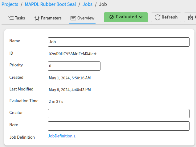 In the job details view, the Overview tab displays the job name, ID, priority, created and last modified dates and times, evaluation time, creator, note, and job definition name. For example: