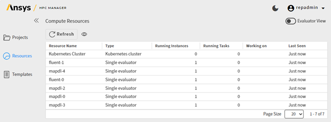 To see which compute resources are currently connected to the Ansys HPC Manager, select Resources in the navigation pane.