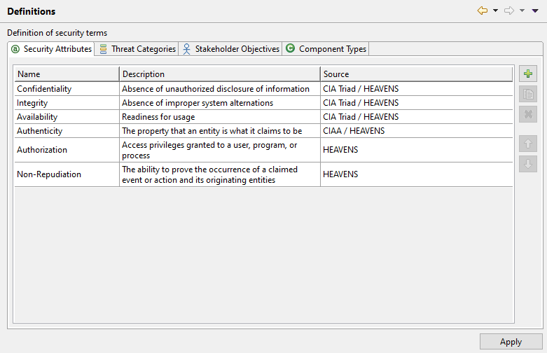 The "Definitions" sub-page can be used to customize the list of known security attributes. Each attribute can be associated with an optional description and a source, basically a reference to the document or method that describes it. The page has further tabs to also define threat categories, stakeholder objectives and component types.