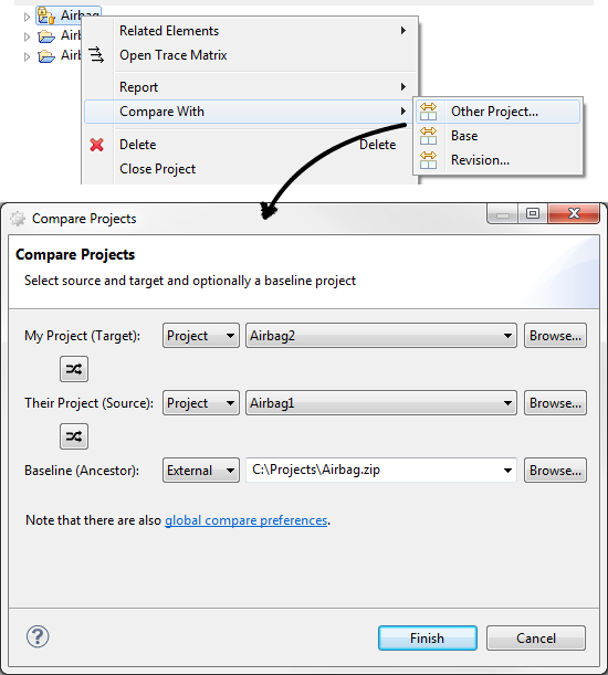 New compare functionality supporting 2-way and 3-way difference analysis of projects has been introduced with this major version (see also Section 10. of the user guide). The comparison can be generally used to visualize the changes that were applied to a project in relation to older versions of the same project or another project.