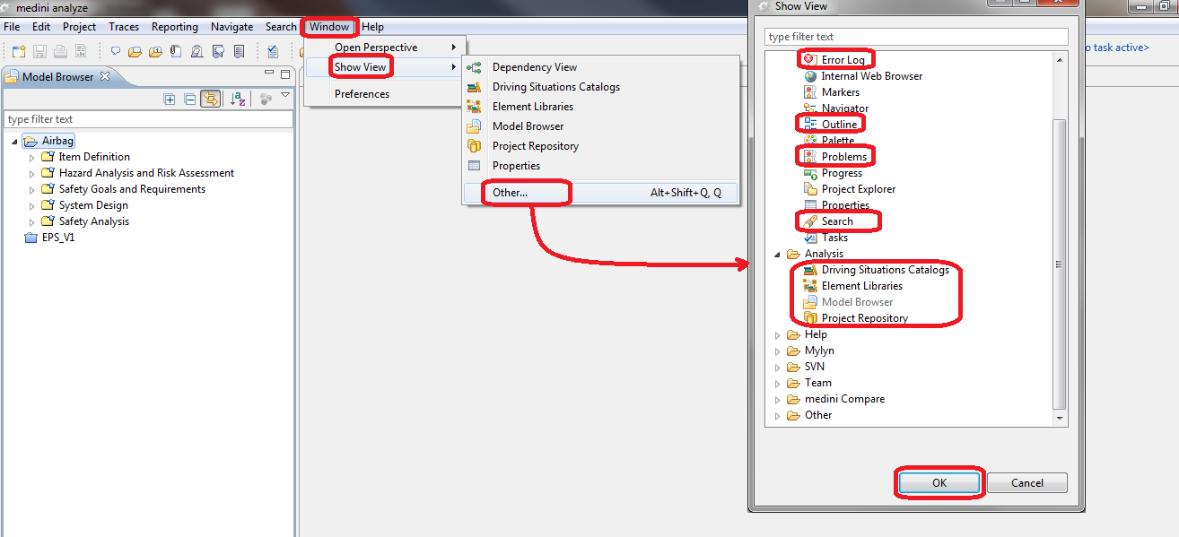 The sub-menu under "Show View" provides a quick access to the most frequently used views. You can activate e.g. the Dependency View, the Operational Situations Catalog View, the Model Browser View, or the Properties View directly.