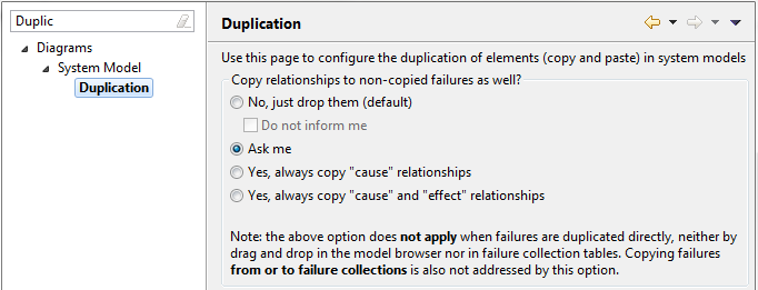 The duplication of relations between failures that are contained in system elements has been made more flexible and configurable. Relationships to causes and effects that are not copied (so called non-copied failures), can now optionally be duplicated as well. The option can be configured in the preferences.