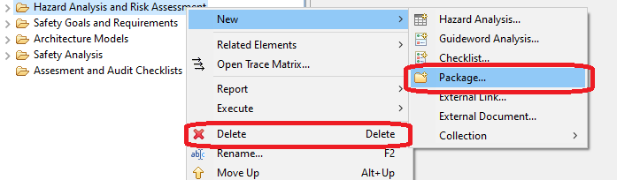 The model browser supports the creation, deletion and modificaton of packages within a medini project. The creation and deletion of packages is triggered by the appropriate context menu of the selected package or project: