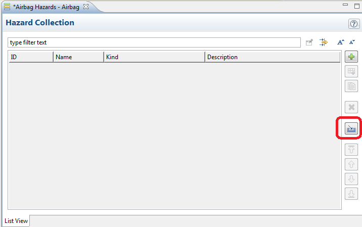 After creation a table editor will open where entries can be added, edited, and removed. Depending on the collection type the columns will vary. Most elements have in common ID, Name, Kind, Description, Severity, and Occurrence (used for FMEA) and show their additional fields as columns (e.g. failure rate for failure modes). In addition, profile columns can be shown as in other table editors, see Profiling mechanism for details.