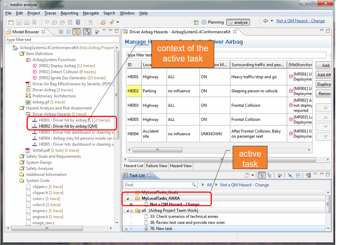 Tasks can be activated or deactivated. When there is an active task medini analyze focuses the model browser to the elements which are in the context of the active task. The focus is visualized by graying out those elements which are not in the context.