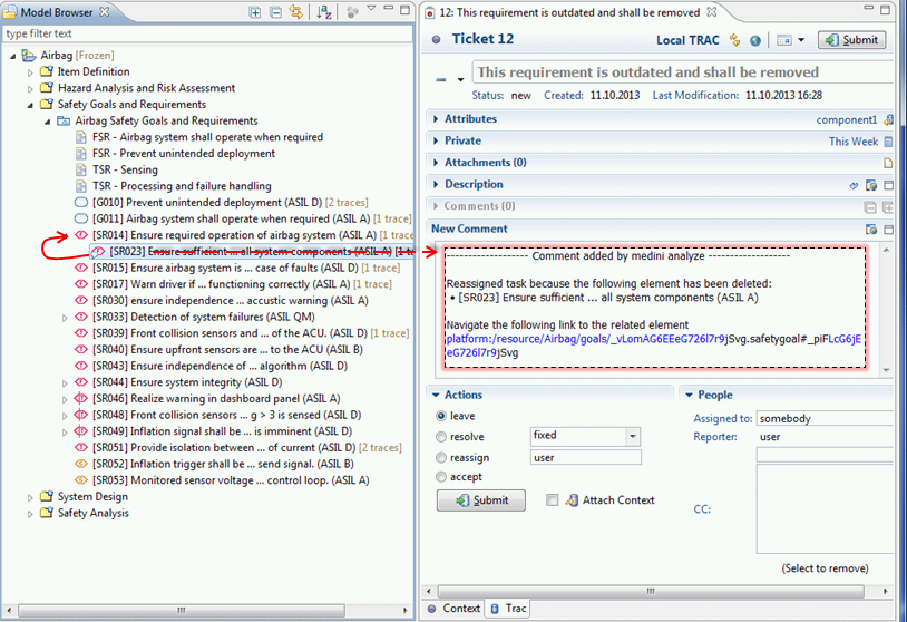 The lifecycle of tasks is independent of elements in medini analyze and solely determined by the underlying task management system/repository. If a task is associated to an element which is going to be deleted, the task (content) might still be valid. Therefore, medini analyze does not close tickets on deletion automatically, but prevent that they loose their context by redirecting them to the nearest remaining parent of the element as outlined below: