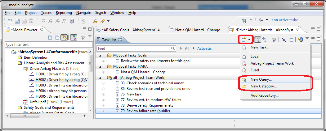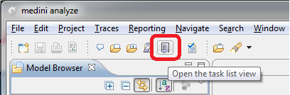 In order to open the task from the model element either the context menu of the element or the tool bar of medini analyze can be used. There are multiple options for opening an associated task from a model element which allow to open all tasks or consider the status of the associated tasks. After the invocation of one of these options, the task editor is opened with the relevant task(s).
