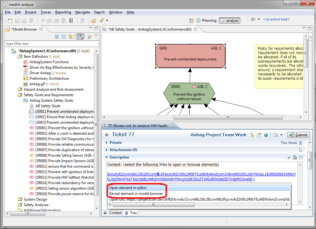 In order to open the task from the model element either the context menu of the element or the tool bar of medini analyze can be used. There are multiple options for opening an associated task from a model element which allow to open all tasks or consider the status of the associated tasks. After the invocation of one of these options, the task editor is opened with the relevant task(s).