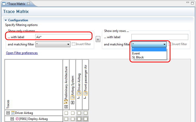 After clicking on "Apply" and closing the Preferences window the newly defined filter will be available for the Trace matrix configuration.