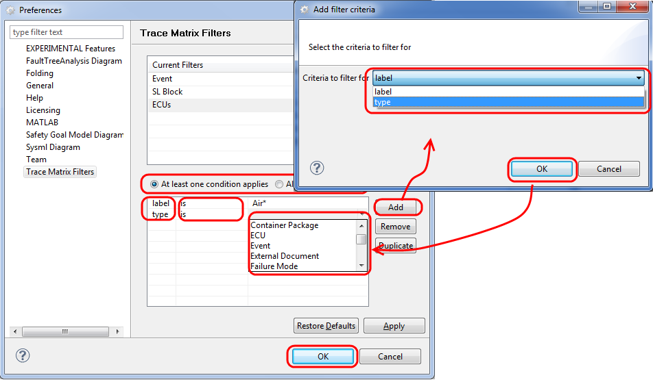 In order to use a predefined filter in the trace matrix configuration it has to be defined beforehand according to your needs. The filter definition wizard can be opened by either clicking on the "Open Filter preferences" link in the Trace matrix configuration or by opening the medini analyze preferences window (Window->Preferences) and selecting "Trace Matrix Filters".