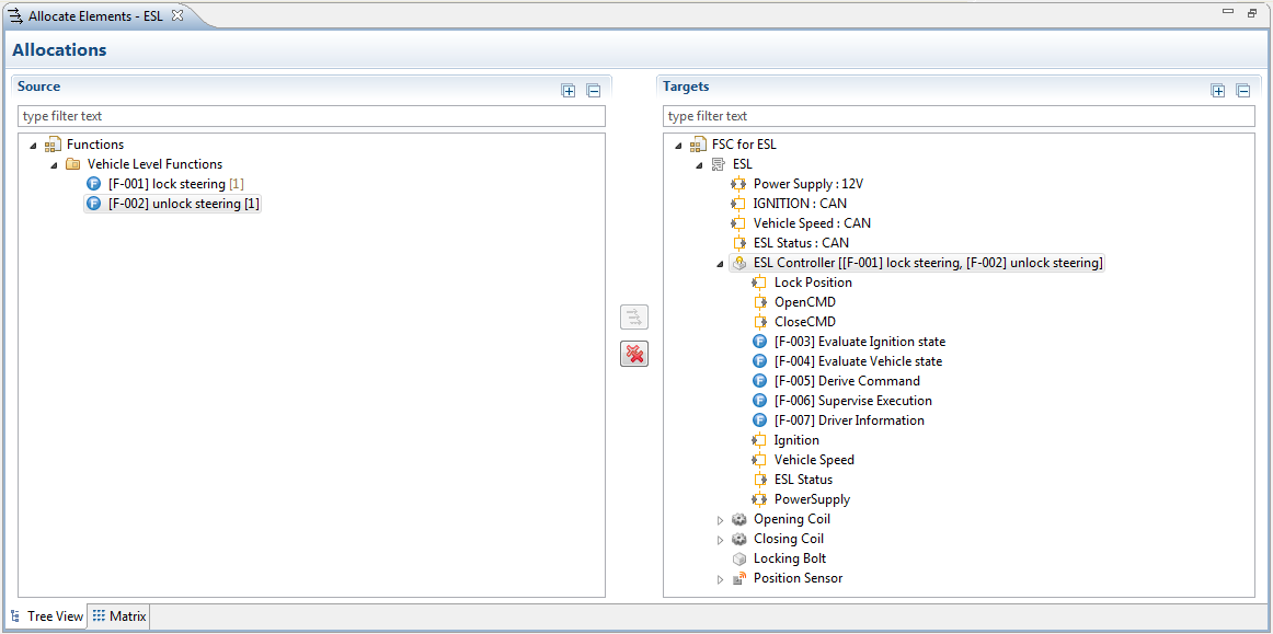 This editor provides two pages with the same functionality as a tree-based editor and as matrix. The tree view page is convenient for larger models (e.g. IP Design model allocations), since it allows to create multiple allocations at once based on the selection in the tree views.