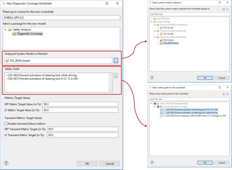 Depending on how the creation was triggered the fields are pre-selected. As alternative the metric target values can be set manually (e.g. for an Safety Element out of Context analysis).