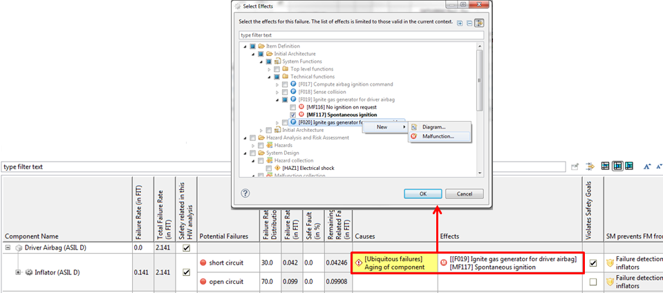 Note that in the selection dialog it is possible to create new failure modes, malfunctions, hazards, etc. on the fly using the context menu. If new elements are created, a name can be assigned immediately while further details must be edited later, after closing the dialog.