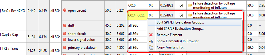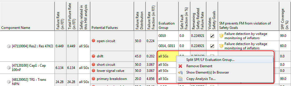 Secondly, the evaluation groups allow you to split the analysis for each failure mode. If you right click on the group cell and select "Split SPF/LF Evaluation Group", you can introduce two (or more) rows for the same failure mode which are bound to a (subset of the) variant(s). That means you can set individually the safe fault fraction, safety mechanisms, and diagnostic coverage (SPF and LF) for each variant in the same analysis.