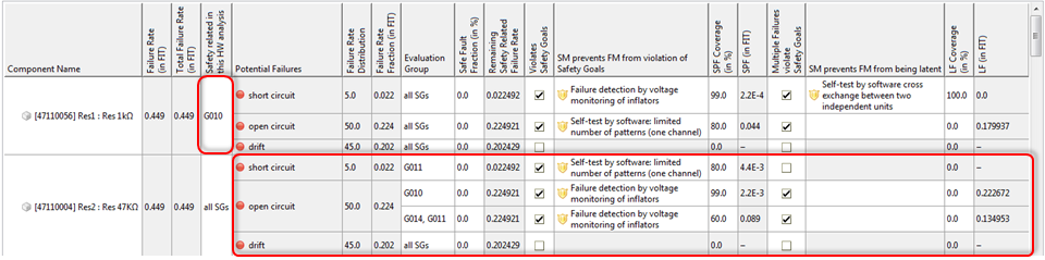 If safety goals need to have different safety mechanisms and/or diagnostic coverage, the evaluation group can be split. In the example "Res 2 - open circuit" has two evaluation groups: