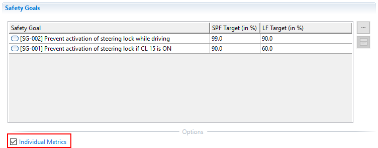 Individual Metrics: Option that allows to distinguish different target values for multiple safety goals. Please refer to Analyzing multiple Safety Goals for more details on how to setup an analysis for multiple safety goals.