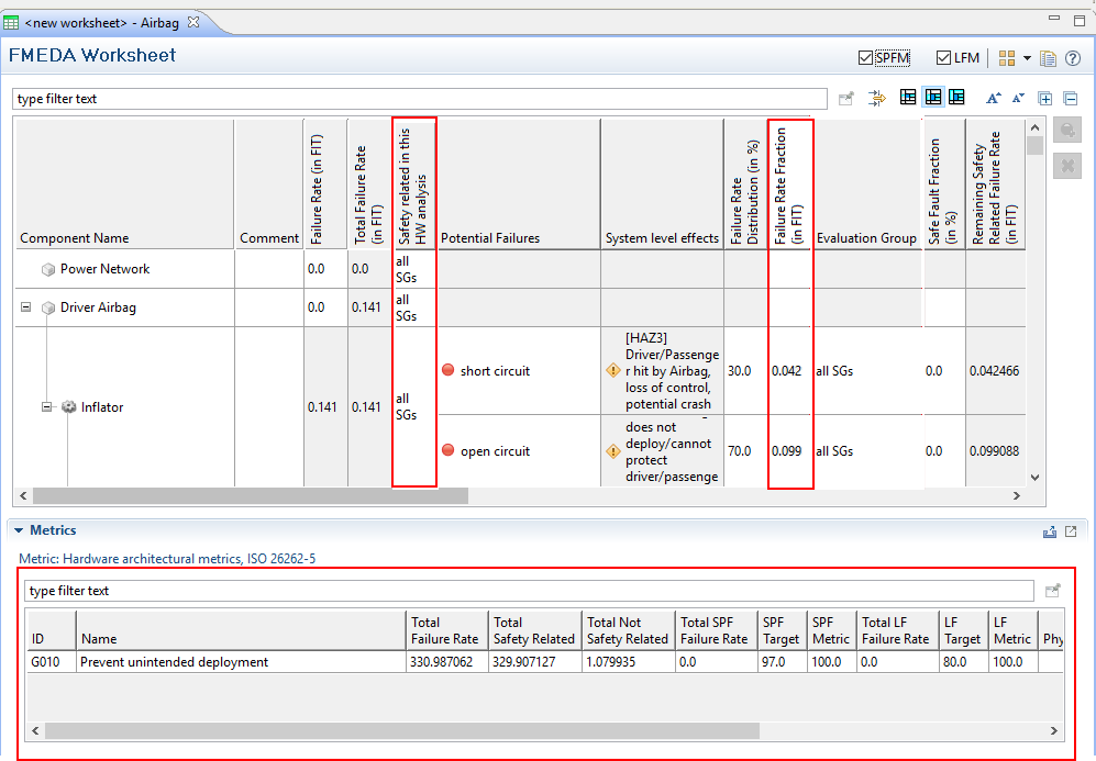Metrics: This area shows the SPF/LF metrics and/or SFF/DC values that are computed automatically by the tool based on the inputs seen in the table above.