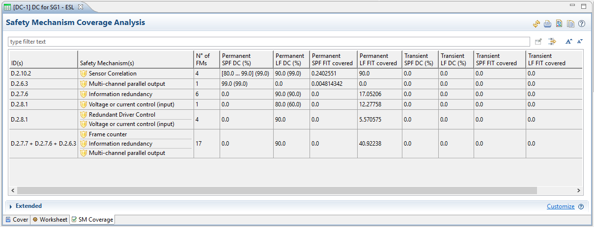 SPF DC (in %): The diagnostic coverage that is estimated for the SM according to the analysis. If the safety mechanism is considered to have different coverages for certain failure modes, a range is shown in the form [<lowest DC>..<highest DC>]. The default DC assigned to the safety mechanisms is given in parentheses. Note that this column exists separately for permanent and transient failures.