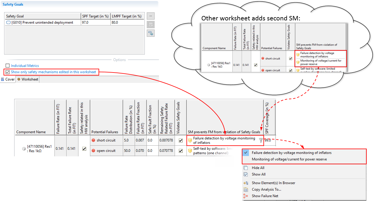 Create multiple worksheets, for each safety goal a separate one. This organization is useful in case safety goals are unrelated and/or if multiple users work in parallel on different safety goals. That means each worksheet provides a separate view for the safety goal on the same data and they share all structural information about the elements, failure mode, failure rates, and so on. Note: the safety mechanisms are assigned to the underlying failure modes, and hence are also shared. By default, they become visible in every worksheet, unless the option "Show only safety mechanisms edited in this worksheet" is enabled: