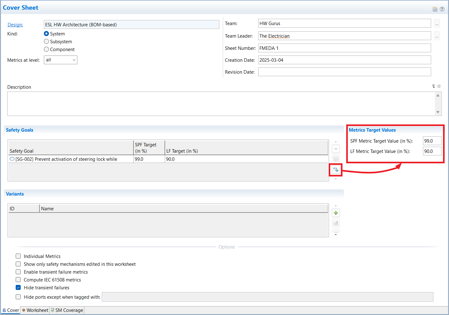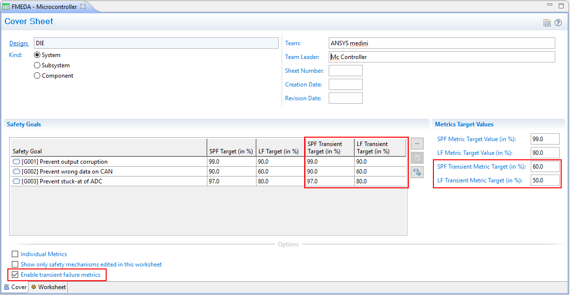 Different target coverage in percentage can be provided for SPF and LF metrics by manually overriden them. Moreover, metrics for permanent and transient failure (soft errors) can be distinguished.
