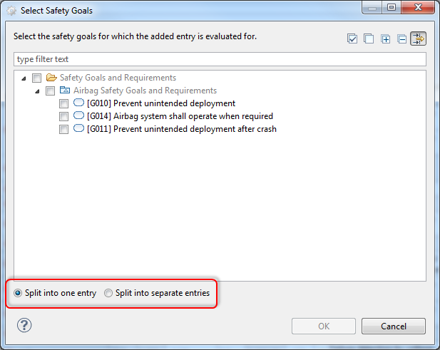 Select the safety goals for which the group defines the SPF/LF parameters. The dialog provides the option to create a single entry or separate evaluation groups per selected safety goal. Note that the dialog shows by default only the filtered safety goals according to the "Safety related" column and/or worksheet. Removing the filter (button in the top right corner) allows to choose any safety goal of the project to quickly widen the "Safety related" column and even add additional safety goals to the whole worksheet.