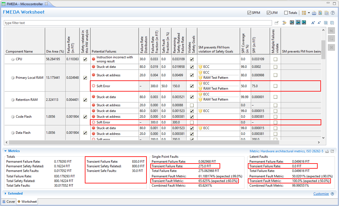 Now all transient failure modes are considered in the corresponding transient fields, i.e. totals for the worksheet (Transient Failure Rate, Transient Failure Safety, and Transient Failure Safe Faults) as well as the SPF/LF metrics section (Transient SPF/LF Failure Rate, Transient SPF/LF Metrics). For convenience, overall metrics for the combination of permanent and transient is shown as well.