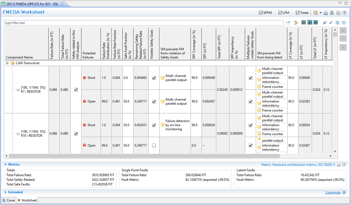 By default each diagnostic coverage worksheet computes one single point fault (SPF) and one latent multiple faults (LF) metric for all safety goals and checks them against the target values given on the editors' cover page. Hence, if multiple safety goals are added to a worksheet, the analysis is not differentiating potentially lower SPF/LF targets, if e.g. one safety goal is ASIL D while others are ASIL C or B.