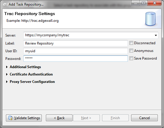 In the task repository dialog it is also possible to add new server task repository locations. For this, a connector for the server has to be present and selected. medini analyze comes with connectors for Bugzilla and Trac. Other connectors can be acquired from 3rd party vendors. The connector specific properties (e.g. server URL and user credentials) have to be provided.