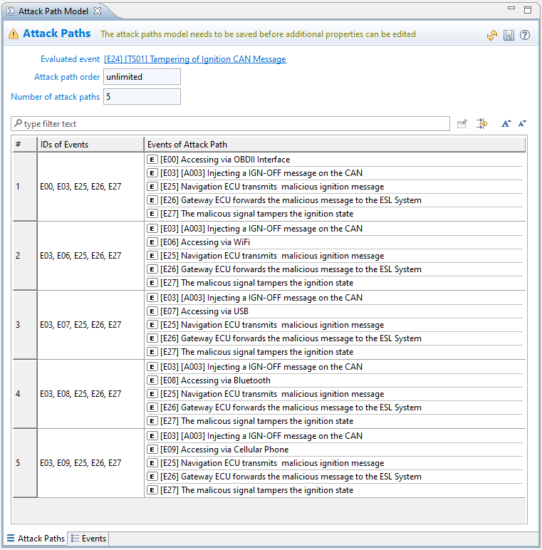 This view shows the different attack paths as a list of attack events. Use the Highlight Attack Path Events option in the context menu of a row in the table to easily identify the set of events of an attack path in the graphical editor for the attack tree.