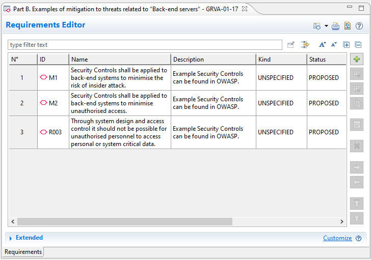 During risk treatment, security goals and new security requirements may be derived or known security requirements, relevant for the system may be selected. They may have relevance for different phases of the system, for example design, but also production and post production. Security goals and requirements and their dependencies can be modeled and documented in dedicated requirements models using a tabular or graphical notation. They can be exported and linked into external requirement management systems to track them or imported from those kind of systems or knowledge databases.