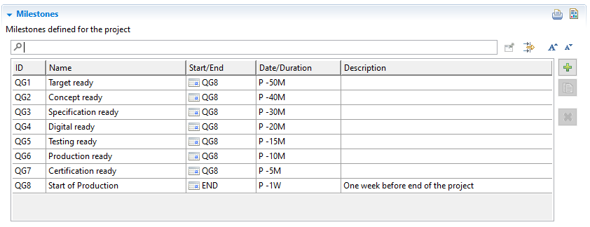 | Timelines and Milestones | The timeline of the safety project can be planned using an arbitrary number of milestones, including optional project begin and end milestones. Milestones define either a fixed date given as ISO 8601 calender date or as ISO 8601 duration in relation to another milestone (offset). Milestones can be used later in safety planning as anchors for safety activities.