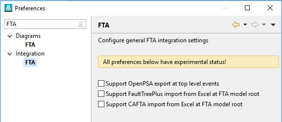 | Integration Preferences | All preferences related to Fault Tree Analysis and the integration with other FTA tools have been moved to a separate preferences page below "Integrations" - and away from several other pages like "Diagrams" as before. Note that most options here are opt-in still, so disabled by default.