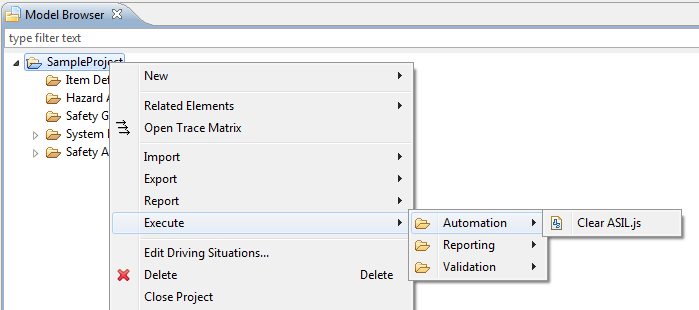 Once published to a project, scripts can be executed via the context menu in the browser as well as in graphical editors. The execution is triggered within the project scope of the current selection. The selection itself is passed as an argument to the script to be able to write context sensitive scripts. If the script returns a result, it is presented to the user in a modal dialog. Note that in graphical editors the represented element is passed in the selection.