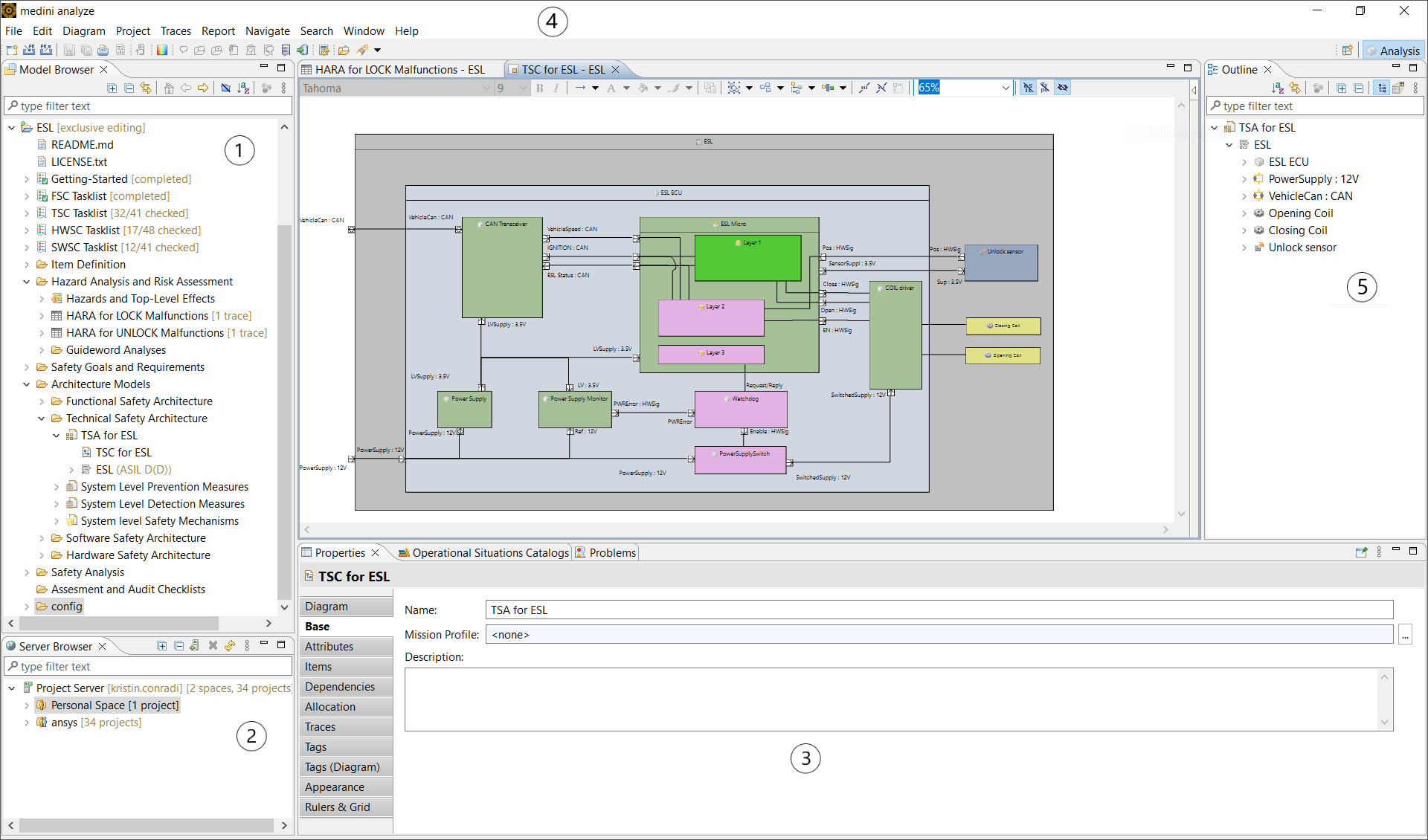 The Model Browser is the main view from where you access and manage your projects. Each project is structured into a number of predefined folders, with each folder serving a special task or group of tasks in the functional safety analysis and design. The initial folder structure depends on the safety domain profile and whether a project template has been used. You can create additional subfolders for each predefined folder, as well as for user-created folders. For more details, see Project Structure and Safety Domain Profiles.