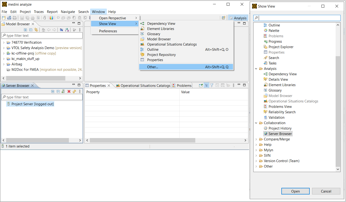 Server Browser: The Server Browser gives you an overview of your project servers. When you want to work collaboratively, you can load projects from the server into the Model Browser or share projects from the Model Browser to the server.