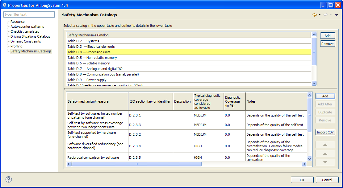 In addition, medini analyze supports the definition of predefined safety mechanism catalogs. These catalogs can be managed in the project settings. In the default templates, the catalogs of safety mechanisms listed e.g. in IEC61508 and ISO 26262 part 5 are provided with the installation. See Project Settings for a description of the generally available settings. These catalogs can serve as basis for custom catalogs.