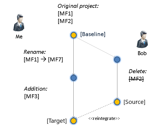The renaming of MF2 to MF3 is not seen in a direct comparison (2-way), since both of you have the same value. Thus, this difference will not show up. In relation to the baseline, however, a 3-way diff can figure out that even though there is no difference between your project and Bob's, there is a difference compared to the baseline. This type of difference is called a "pseudo conflict", because both projects changed the same data without actually producing a conflict.
