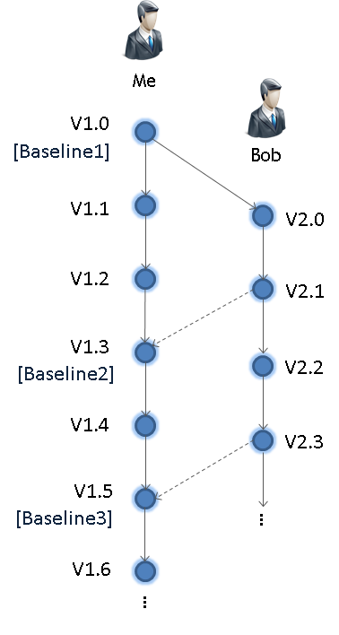 When starting with concurrent work, an initial project must be shared between the users (V1.0 in the figure). This version is literally the baseline where parallel work starts, but this does not mean it necessarily has to be a "baseline" in the configuration management solution (CMS) used. Because medini analyze connects to an existing CMS, the sharing implementation may vary depending on the system used. For example, if a Subversion (SVN) repository is used, users can work on separate branches and commit changes for some time without interfering with other users (e.g. V.1.1 to V1.3). Working on a single branch--or even without a CMS, by exchanging the project as plain file--is also possible (see details below). Afterwards, all users apply changes to their copies of the project as required.