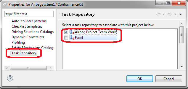 In order to connect to a server repository, the project settings have to be used. If the project settings view is opened (see Project Settings for infos on the project settings), the "Task Repository" entry needs to be activated. There, it is possible to select or de-select the associated server side task repository. Only one repository can be associated with the same project at a given time.