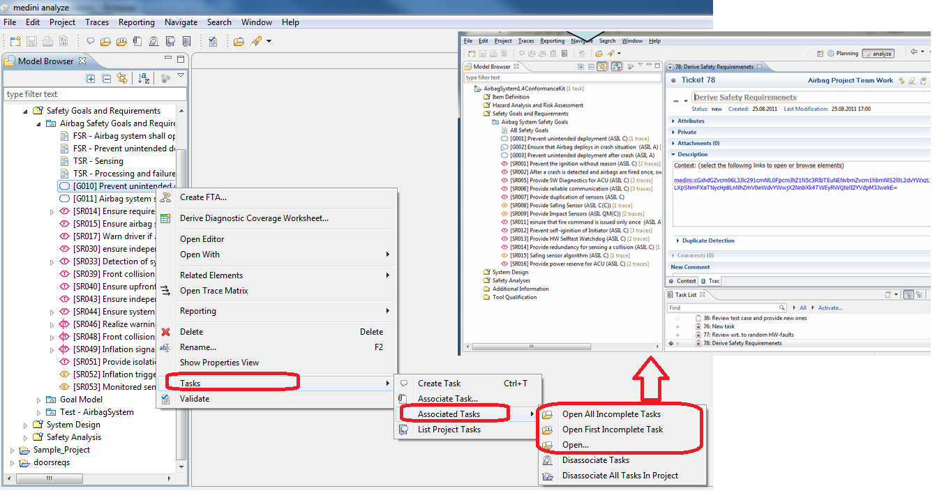 In order to open the task from the model element either the context menu of the element or the tool bar of medini analyze can be used. There are multiple options for opening an associated task from a model element which allow to open all tasks or consider the status of the associated tasks. After the invocation of one of these options, the task editor is opened with the relevant task(s).